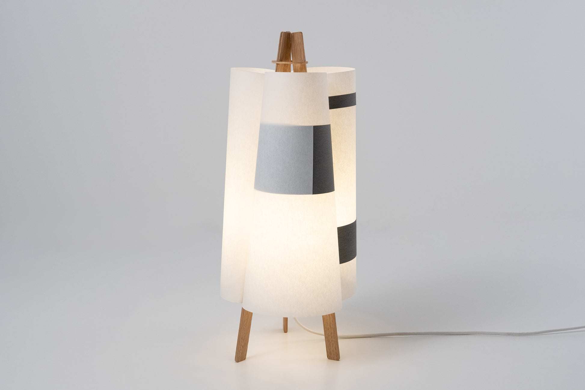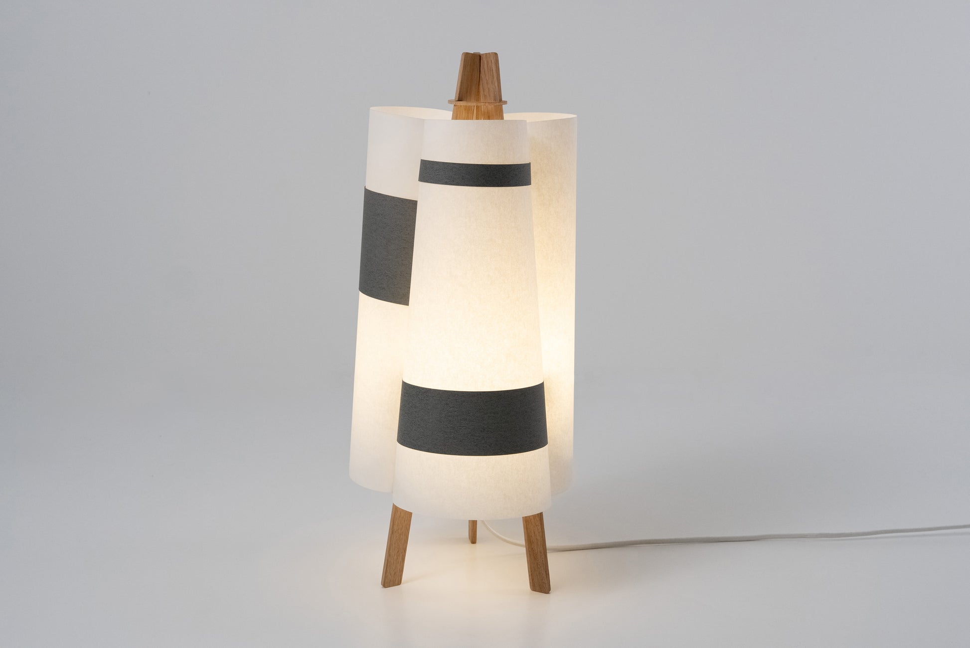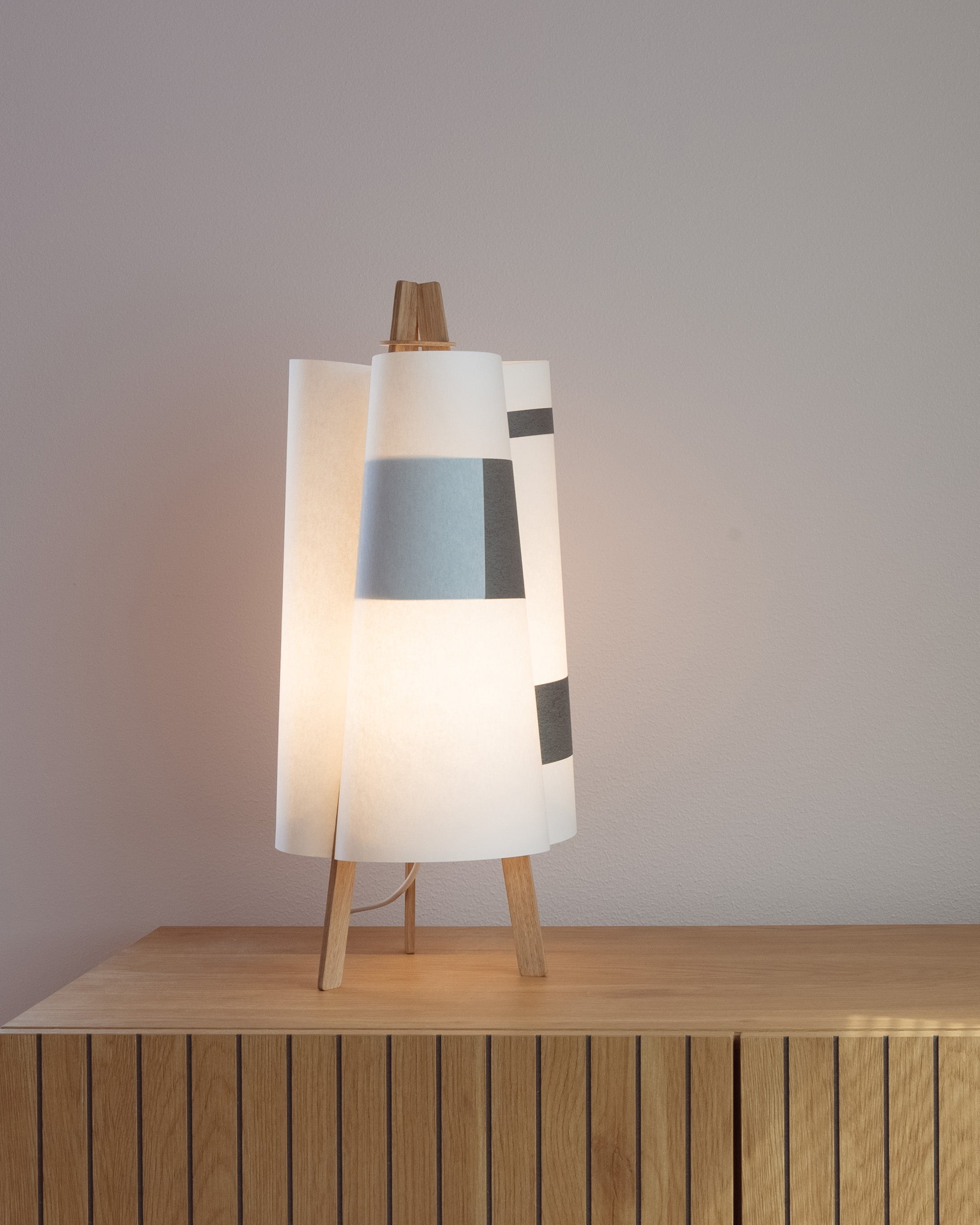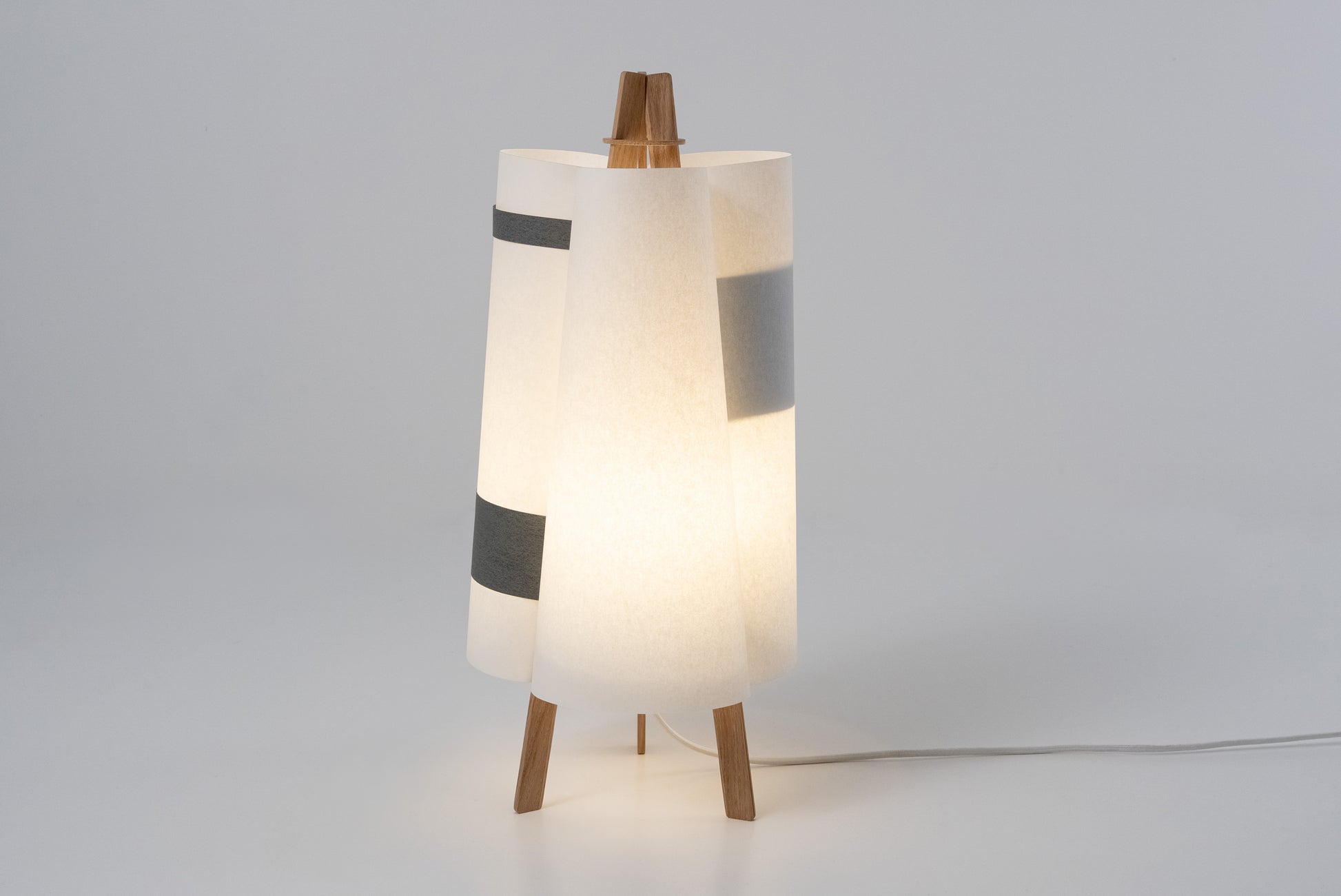 TEX006 is a table lamp that blooms like a quiet flower—three gentle surfaces curve inward, meeting in oak and black strips, forming a three-petal silhouette from above. Born from flat sheets, it opens into balance and light, its shape held in graceful tension. Freestanding and inviting, it lends a soft, comforting glow to windowsills, low lounge corners, or the calm of a futon bedroom.