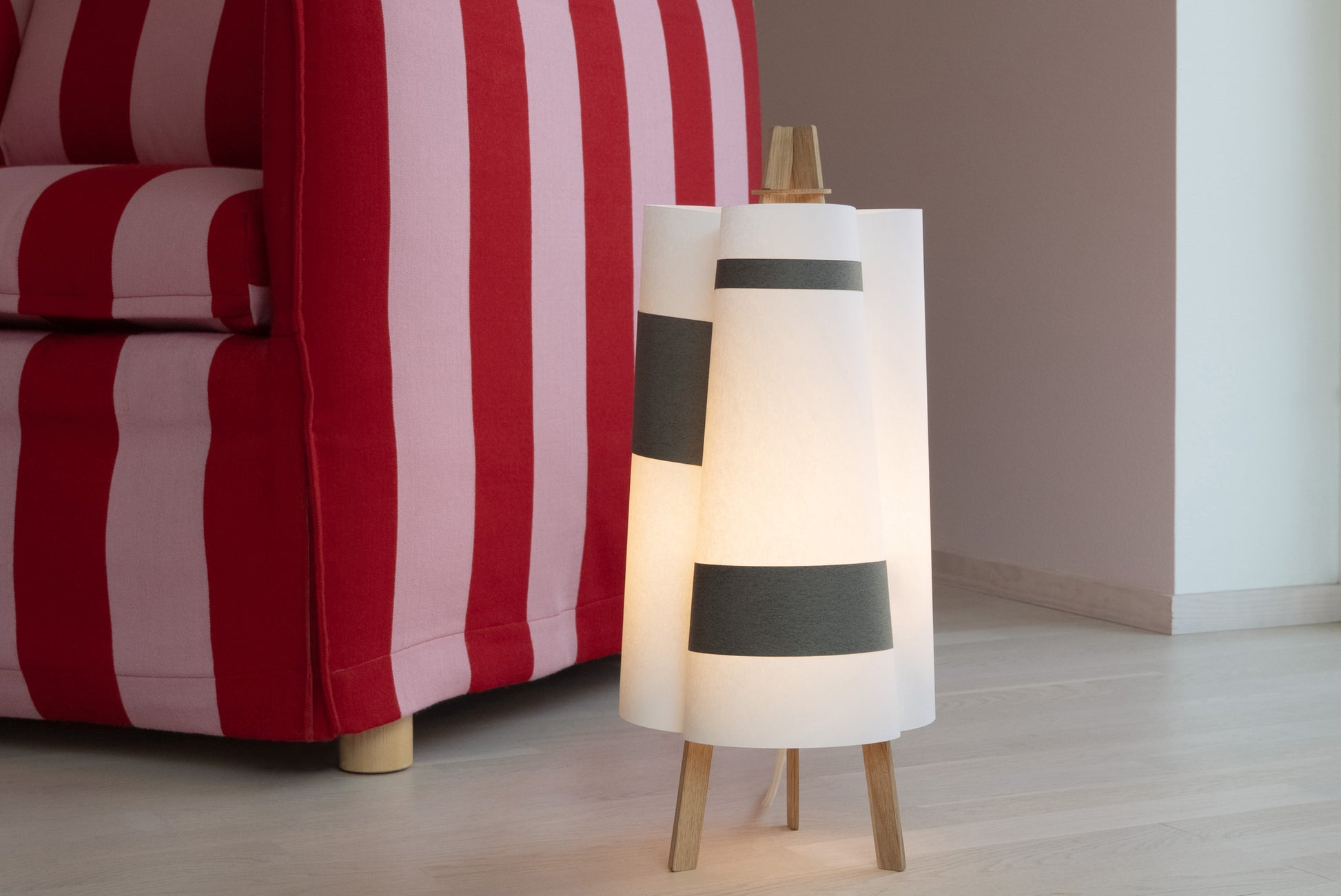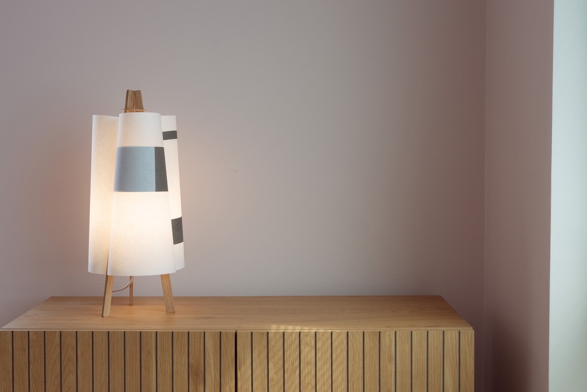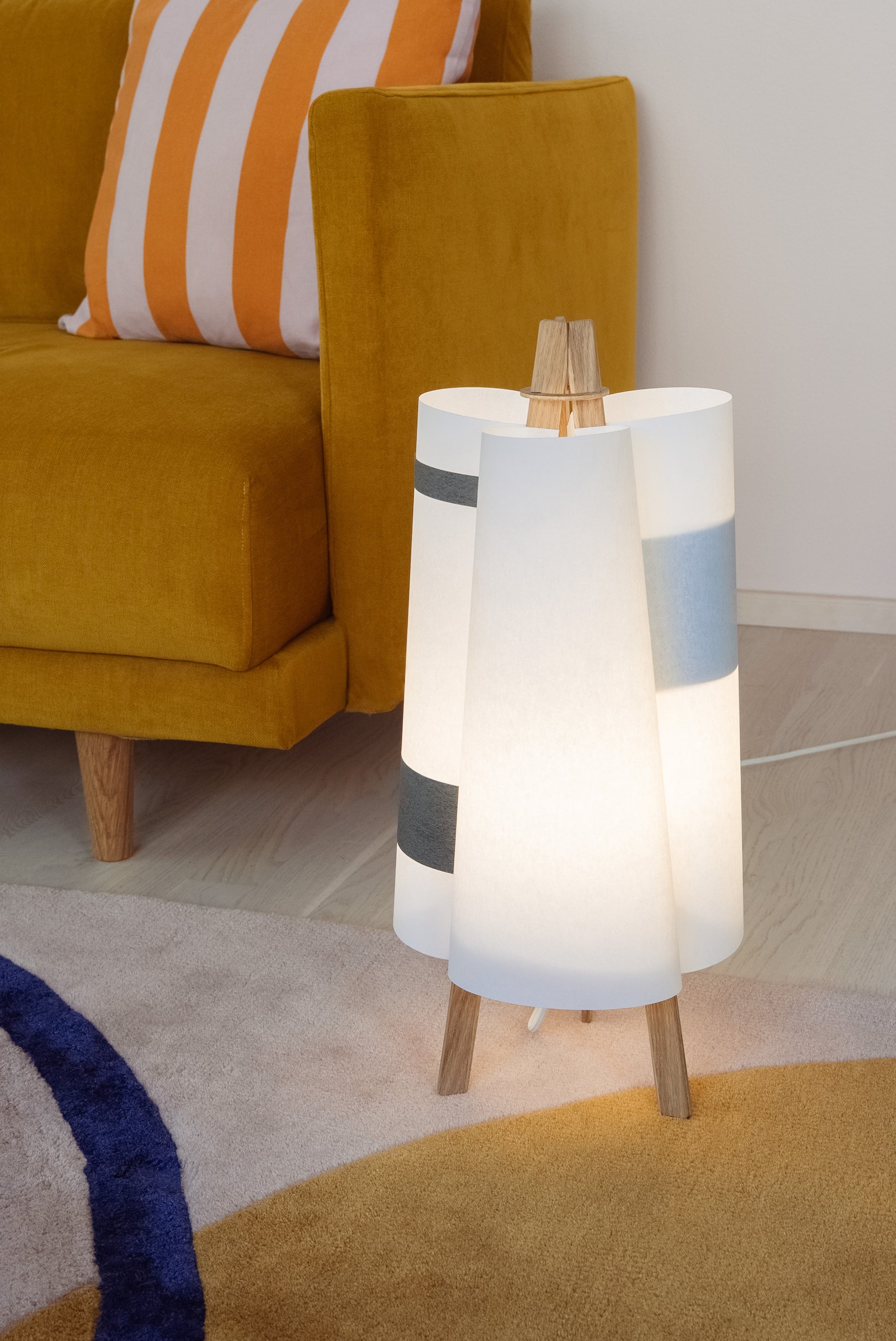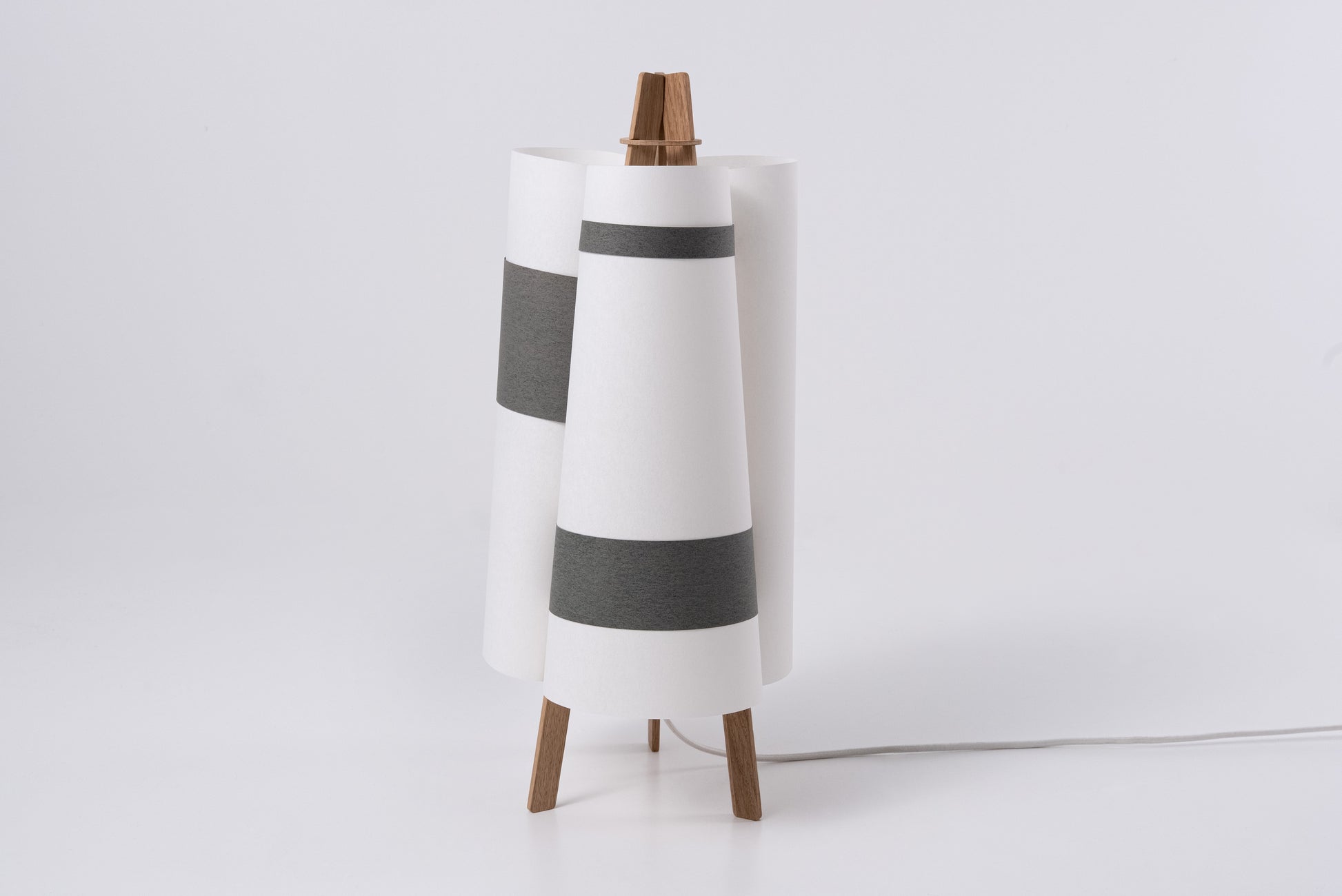 TEX006 is a table lamp that blooms like a quiet flower—three gentle surfaces curve inward, meeting in oak and black strips, forming a three-petal silhouette from above. Born from flat sheets, it opens into balance and light, its shape held in graceful tension. Freestanding and inviting, it lends a soft, comforting glow to windowsills, low lounge corners, or the calm of a futon bedroom.
